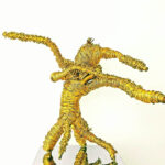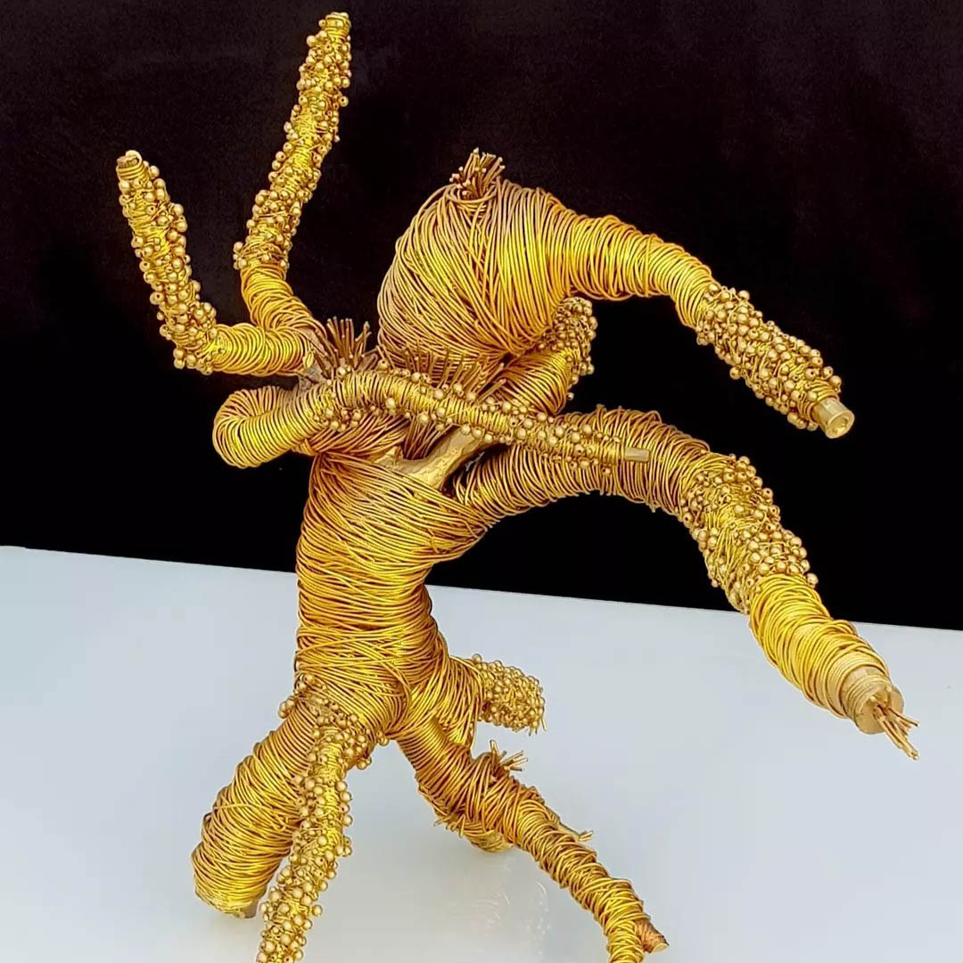 Aluminium gold wires on wood.