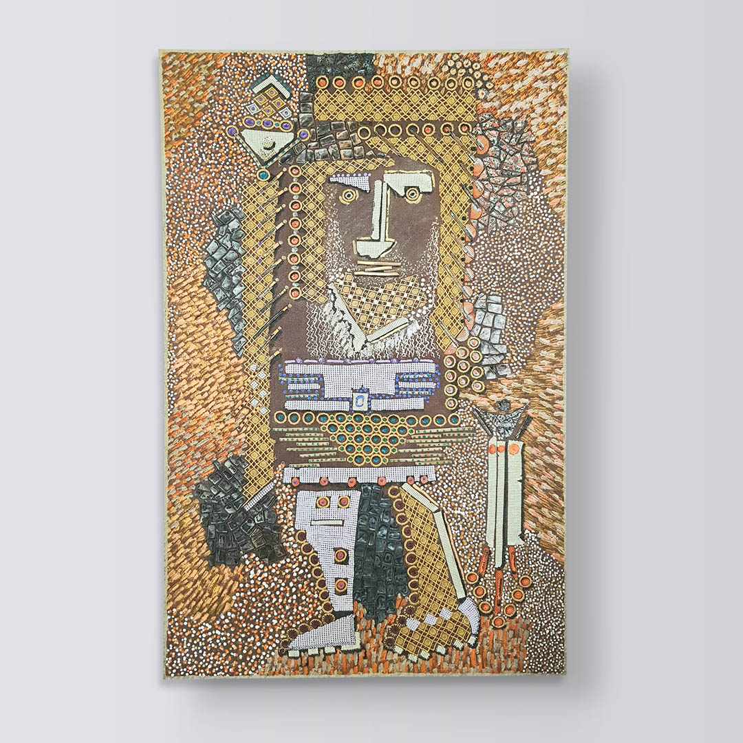 Mix media Upholstery fabric,leather, acrylic paint on Hessian fabric.